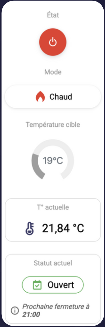 Réglez vos zones, consignes chaud/froid, horaires, tolérances et régulation PID. Configurez également des alertes d’anomalies pour garder la maîtrise complète de vos intégrations GTB.